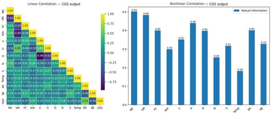 A strong positive linear correlation (0.55) was observed between CO2 output and the ER variable. This relationship indicates a direct connection between these two variables in energy conversion processes, with higher energy demands being associated with increased CO2 emissions. In contrast, a strong negative relationship (−0.43) was found between CO2 and SB. This can be attributed to changes in process stability or the equilibrium processes occurring during combustion. A weak negative relationship (−0.27) was observed between CO2 and FC, which suggests the presence of a latent interaction that may be better explained through nonlinear analysis. On the other hand, the strong negative correlation (−0.96) observed between C and O explains the chemical equilibrium processes between carbon and oxygen. Similarly, a strong negative correlation (−0.80) was found between Ash and VM, reflecting processes such as the increase in ash content due to a decrease in volatile components during combustion.