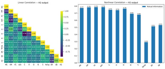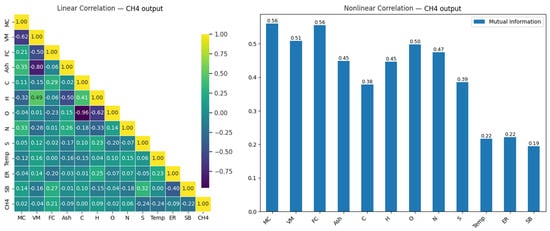 In the nonlinear analysis, the variables MC (0.56), VM (0.51), and FC (0.56) were found to be determinants of CO2 output, according to their mutual information values. This highlights the effect of fuel moisture content and volatile component ratios on CH4 formation. In contrast, variables such as SB (0.19), ER (0.22), and Temp (0.22) exhibited a limited effect with lower values. The increased importance of O and N in the nonlinear analysis, despite being seen as having low impacts in the linear analysis, suggests that oxygen and nitrogen play an indirect but significant role in chemical reaction processes.