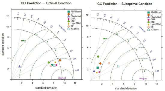 When examining the models’ prediction performances under suboptimal conditions, the XGBoost model provided CO level predictions with lower error (RMSE = 5.291, RAE = 12.804, MAPE = 14.286) compared to the other models. Furthermore, it was observed that XGBoost still offered high accuracy (R = 0.889) under these conditions. The Elastic Net and KNN models performed inadequately, exhibiting high error and low R values (R = 0.324 and R = 0.289, respectively). These results demonstrate that the XGBoost model achieved successful CO level predictions under challenging conditions.