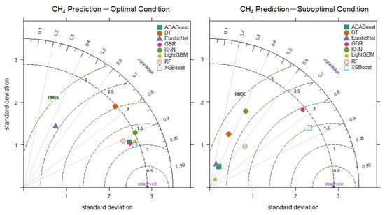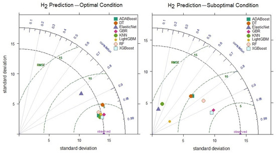 CO, CO2, H2, and CH4 gases are significant outputs in biomass gasification processes. These four gases are produced during the decomposition of biomass in the gasification process and play a critical role in energy production and environmental impacts. This section separately examines the prediction performance of different machine learning methods for CO, CO2, H2, and CH4 gases under optimal and suboptimal conditions.