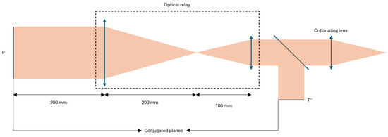 The optical part (Figure 4) consists of a 1-inch lens with a focal length of 100 mm for the collimator. Next, the collimated light undergoes transmission through a 4f system with a magnification factor of 2, achieving a field of view with a diameter of 40 mm. The relay setup for this process involves the utilization of two achromatic lenses. The first lens is an achromatic lens with a focal length of 100 mm and a diameter of 1 inch. The second lens is an achromatic lens with a focal length of 200 mm and a diameter of 3 inches. Subsequently, the light is reflected on the silicon wafer and collected on the aforementioned conjugate planes by an ASI6200MM Pro camera, which has a resolution of 6388 × 6388 pixels with a pixel size of 3.8 μm. With these characteristics, the theoretical lateral resolution is 7.56 μm. The light source used here is a 400 nm LED. The selection of a 400 nm LED as the light source was based on two important criteria, namely, the diffraction limit and the Fresnel distance.