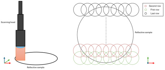 Schematic representation of the complete detection process. The scanning head incorporates the 4f system. Scanning proceeds row by row, as illustrated in the right panel. The overlap between consecutive measurements is consistent with the overlap between rows.
