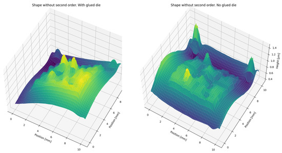 Lastly, one of the most interesting results is provided by the stress induced during die-to-wafer bonding. Process-induced overlay errors are a growing problem in meeting the ever-tightening overlay requirements for integrated circuit production. By calculating the stress, the overlay error can be minimized. In Figure 17, the stress produced by a film deposited over a die has been calculated using the Stoney equation, which, as said before, is valid if the film is much thinner than the substrate, the residual stress and thickness of the film do not vary with spatial position, and the deformation is elastic. Taking this into account, and considering that the wafer and film were assumed to be elastic and isotropic, the residual stress in the film was calculated using Equation (8). Note that the discontinuities of the die-to-wafer bonding cause some artifacts that strongly affect the scale of the plot; nonetheless, in the inner part of the die, where some wavy artifacts caused by the bonding can be seen, the values are on an order of magnitude of hundreds of MPa. These are typical values for induced stress in thin films over silicon wafers, as shown in [37]. Lastly, the curvature obtained from the direct differentiation of the shape obtained by the machine in Equation (8) is the delta shape between a die with die-to-wafer bonding and a die without it, as the required value is the stress induced during the process.
