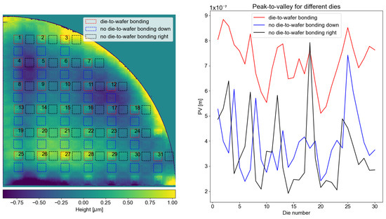 The global shape is shown with the second order removed. Die-to-wafer bonding and non die-to-wafer bonding dies enumeration. The measure was downsampled in order to speed up the die detection (left). Peak-to-valley for both type of dies (right).