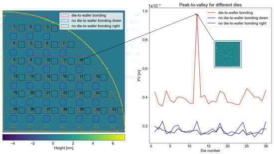 High-pass filter die-to-wafer bonding and non-die-to-wafer bonding dies enumeration. The measure was downsampled in order to speed up the die detection (left). Peak-to-valley for both type of dies (right).