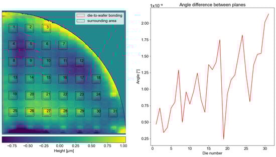The global shape is shown with the second order removed. Die-to-wafer bonding and non die-to-wafer bonding dies enumeration. The measure was downsampled in order to speed up the die detection (left). Angle differences between the best fit plane of the red dashed area and the best fit plane of the area between the red and black dashed lines (right).