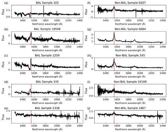 Spectral images of the BAL (a–e) and non-BAL (f–j) samples. The red line at 1549 Å marks the position of the C IV spectral line in the spectrum, which was used to assist in comparing the spectral features of the BAL and non-BAL samples. The number in the title is the sample number.