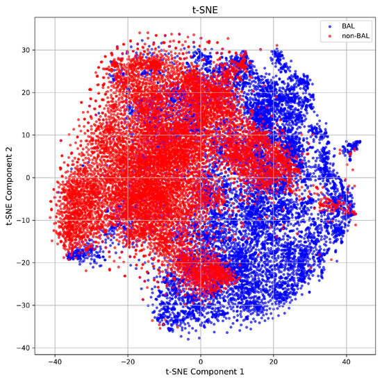 Two-dimensional representation of the BAL quasar (blue) and non-BAL quasar (red) data after reduction using the t-SNE algorithm.