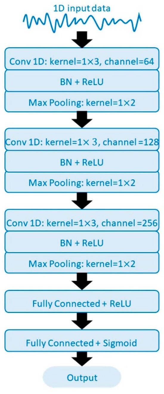 In Section 3.1, we applied various methods of dimension reduction for the extraction of features. Next, we used the simplified data as inputs for a deep learning classification model and formed this model to classify quasars. A convolutional neural network (CNN) is a very successful deep learning model for image processing and computer vision tasks. It automatically learns the features of images through convolution, pool, and full connection layers, allowing tasks such as image classification and object detection to be performed [35]. For the classification of quasars, spectral data can be used as a particular type of one-dimensional image, allowing a CNN to learn the features within a spectrum to distinguish BAL quasars from non-BAL quasars. In astronomy, a CNN can be used for various tasks such as galaxy classification, object detection, spectral classification, etc. [36,37,38]. For example, as part of a mission to classify galaxy images, a CNN can learn to distinguish different types of galaxies, such as elliptical and spiral galaxies, using images observed through a telescope [36]. The convolutions capture the texture and shape features of galaxies, allowing for high-precision classification. In object detection missions, a CNN can be used to detect targets such as planets, stars, and galaxies in celestial patrol data [39]. By sliding a convolution core over an image, a CNN can automatically locate astronomical objects. As part of spectral classification tasks, a CNN can learn the features of spectral data in different wavelength regions and perform tasks similar to image classification. For example, with quasar spectral data, a CNN can distinguish between broad- and non-broad-absorption lines [40].