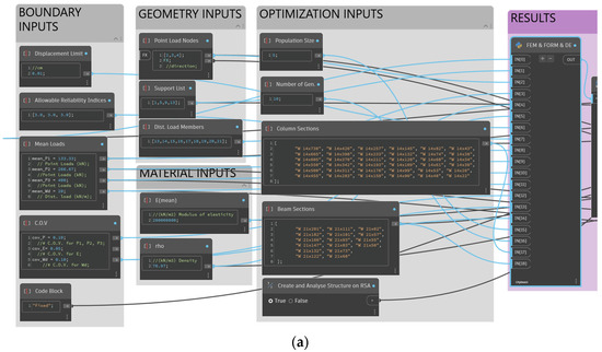 In this part, all input parameters used during the workflow, such as population size, generation number, design variables, etc., are defined as presented in Figure 3a. Subsequently, a Python node is utilized to obtain LSF results using the created wire model on Dynamo. The list created in the previous section is connected to the Python node with “IN[0]” as depicted in Figure 3b. As can be understood from the figure, the list is defined as an input that contains all the elements and corresponding information. Based on those obtained information, a structure and FEM model are created to perform structural analysis, which will give the displacement results for different evaluations. For this step, the PyNite Python library is utilized and the pseudo-code is presented in Algorithm 1 to provide better understanding. For more detailed information about the Python code, please refer to the GitHub website [60].