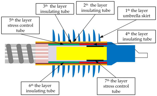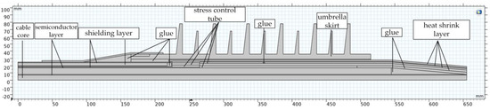 In this study, an EN50264 standard 27.5 kV semi-rigid high-voltage cable and terminal are used for modeling [32]. The EN 50264 standard provides important input parameters for cable simulation such as material, geometric structure, thermal characteristics and electrical properties, which can greatly improve the accuracy and practical applicability of the simulation. Especially in complex, high-safety scenarios such as railway environments, the guidance provided by the standard can be used to develop safer and more efficient cable designs. The cable model and its terminal structure are mainly composed of a cable core and seven layers of an insulation structure [32], as shown in Figure 1. The outermost layer is an umbrella skirt to provide creepage distance; the second, third, fourth and sixth layers are insulated tubes, which play the main role of withstanding voltage; and the fifth and seventh layers are stress control tubes, which are used to improve the electric field distribution at the end of the cable and suppress electric field distortion.
