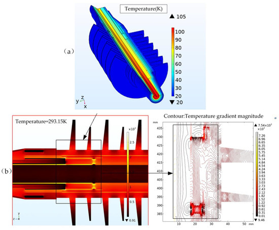 Under preset conditions, the thermal field simulation of the simulation model was carried out to obtain the cable temperature distribution. The simulation results are shown in Figure 4. By comparing the temperatures of different structures, it was found that the core is the heat source of the cable terminal, and the highest temperature is 105 °C, as shown in Figure 4a. At the same time, it was observed that the temperature deceases with increasing distance from the cable core. When in the shield layer and the glue, the temperature near the stress tube approached the air temperature. When the cable was energized and heated, due to the varying thermal conductivity and temperature increases in different structural materials, the effects of temperature increases and thermal expansion had a strong influence on the deformation of the cable, which easily leads to the generation of air gaps and aggravates the aging and failure of a cable. Therefore, in order to further study temperature increases in different model structures when the cable is energized, internal temperature increases in the cable and terminal were calculated, as shown in Figure 4b. It was found that temperature increases between the outer semiconductor, the insulating layer and the junction of the stress control tube (x = 385 mm and x = 430 mm) is the largest. In practical engineering, the junction of the semiconductor, insulating layer and stress control tube of the cable is more prone to abnormal deterioration and failure [8,33]. The simulation results of the cable thermal field model were consistent with the actual project, which also proves that the huge temperature difference between the semiconductor layer, insulation layer and stress control tube is an important reason for the deterioration and failure of a cable. In the following research, the thermoelectric coupling simulation based on cables further revealed the damage and aging mechanisms of cables caused by temperature differences.