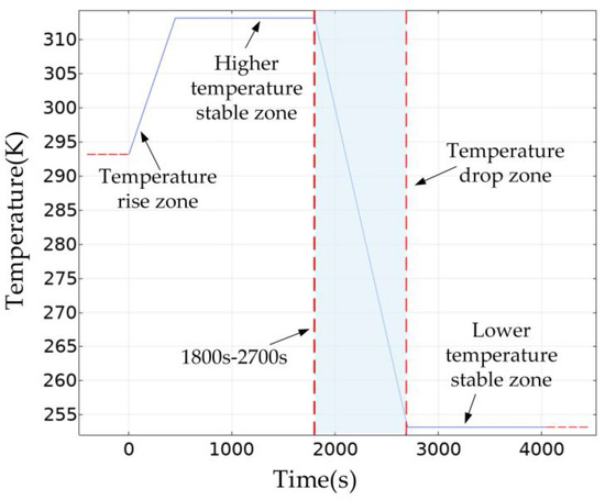 Based on the above definition formula for changes in ambient temperature over time in electrified railway cables, a cable working environment temperature change curve with time was developed, as shown in Figure 5. It was found that t = 0 s to t = 4000 s can be divided into four zones, and t = 0 s to 450 s is the temperature increase zone. T = 450 s to t = 2700 s is the higher-temperature stable region, t = 2700 s to t = 4000 s is the temperature-drop zone, and t = 0 s to 450 s is the lower-temperature stable zone. In the four zones, the temperature difference from t = 1800 s to t = 2700 s—the temperature-drop zone—is the largest, which easily leads to cable air gaps and exacerbates cable aging. Therefore, the temperature difference from t = 2000 s to t = 2040 s in the temperature-drop zone was selected to further study the effect of environmental temperature differences on the cable temperature distribution.