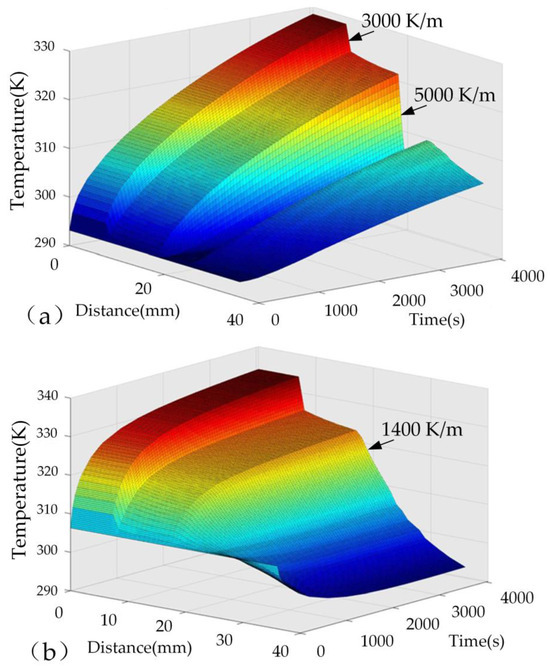 The temperature change diagram of the weak line of a cable with time. (a) 385 mm. (b) 430 mm.