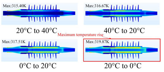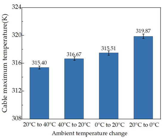 Further research identified the maximum temperature of the cable under different temperatures and different environmental temperature changes, as shown in Figure 9. When the ambient temperature decreased from 20 °C to 0 °C, the air gap temperature increased the most, reaching 319.87 K. When the ambient temperature was 20 °C to 0 °C, the air gap temperature inside the cable was the highest. Under the alternating action of internal and external cold and heat, the interlayer stress changed, and the interface was not tightly bonded. With deformation inside the cable, the air gap developed further, and the cable deteriorated.