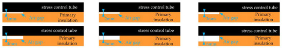 Cable air gaps are prone to partial discharge, and the energy generated by discharge caused the air gap temperature to change sharply, which further aggravated the deformation of the air gap and aging of the cable; air gaps may cause potential threats to the stability and security of a traction power supply system. In order to study the influence of air gap thickness on the internal temperature of a cable during operation, a cable model with different air gap thicknesses was built, as shown in Figure 10. The air gaps between the stress control tube and the primary insulation layer were 1 mm, 2 mm, 3 mm, 4 mm, 5 mm and 6 mm.