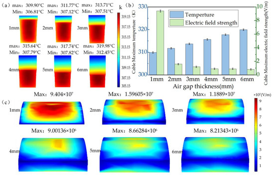 Cable simulations under different air gap thicknesses. (a) Thermal field. (b) Electric field. (c) Cable max temperature and max electric field strength.