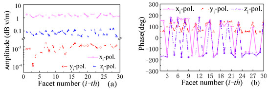 To illustrate the characteristics of the Bessel vortex wave, the amplitude and phase profiles of an x-polarized electric field distributed along a latitude line on a sphere with a radius of 150 mm are shown in Figure 2. The amplitude of the x-polarized component was much larger than that of the cross-polarized y-component. Furthermore, a small longitudinal z component field appeared with an increase in the propagation distance. What is more noteworthy is that the amplitude, phase, and polarization of the incident Bessel vortex electric field were different at each selected facet element, which led to its inapplicability for the traditional PO method in scattering. Therefore, the ASE combined with PO is an effective approach to address this problem.