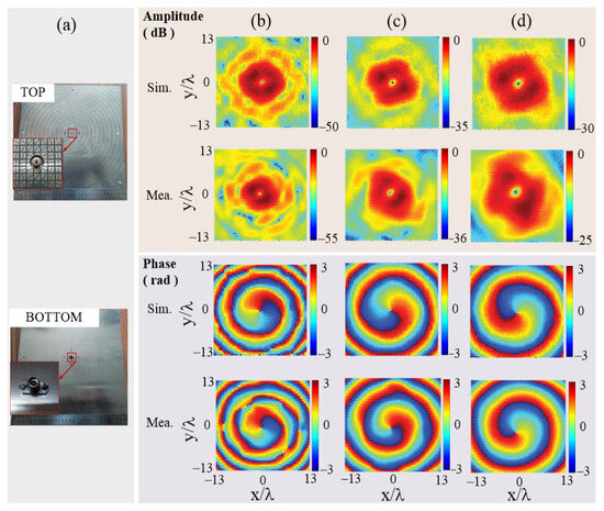 Figure 4. Metasurface Bessel vortex antenna and amplitude/phase distributions. (a) Prototype, (b) observation plane was 1000/(c) 1500/(d) 2000 mm away from the antenna.