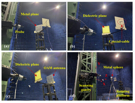 Figure 5. Experimental scenario of the plane-near-field OAM scattering of several standard targets. (a) Metallic plate, (b) FR4 plate, (c) FR4 transmission, and (d) sphere.