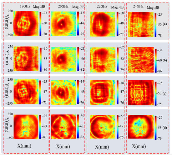 Figure 6. Measured near-field amplitude distributions at different frequencies. (a) Metallic plate, (b) FR4 plate, (c) FR4 transmission, and (d) sphere.