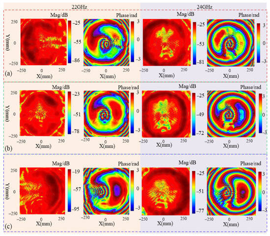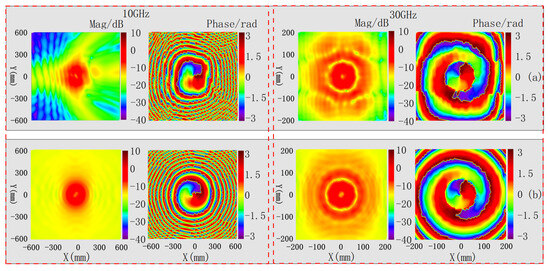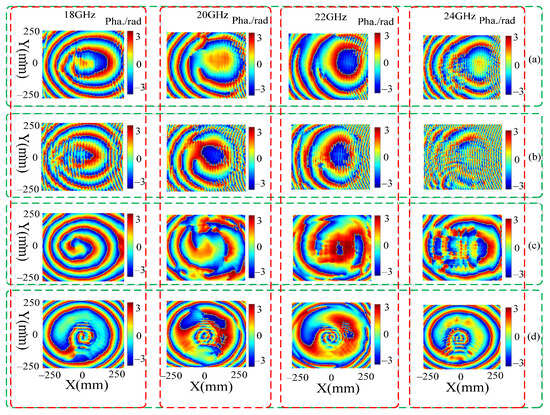 Figure 7 presents the phase distributions corresponding to each case in Figure 6. Both the reflected and transmitted phase for the plate and the scattered phase for the sphere had helical distributions. Since the characteristics of the transmitted field was closest to that of the incident field, the helical phase wavefront features were the most obvious. The phase of the transmitted field above 20 GHz was distorted to a certain extent, as shown in Figure 7c, but still showed helical phase wavefront characteristics. It can be seen that the clockwise phase spiral direction of the transmitted wave was consistent with that of the incident vortex wave, indicating that the topological charge of the vortex EM wave transmitted through the dielectric plate remained unchanged. However, the helical phase distributions of the reflected and transmitted fields were the opposite, which proves that the topological charge of the vortex wave reflected through the plate becomes a negative value of the previous one.
