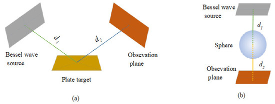 The Bessel antenna center, sphere center, and the receiving probe were assembled on the same horizontal line, forming the on-axis condition as shown in Figure 5d. Selecting 20 GHz as the working frequency, the Bessel amplitude and phase distributions presented in Figure 6 of [14] indicated that the radius of the first ring of the intensity distribution was within 150 mm. Therefore, the radius of the experimental sphere was introduced as 150 mm so that the target was sufficient to block the main energy of the wave source, resulting in little influence on the forward scattering.