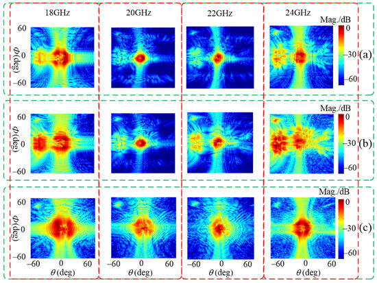 Figure 11. Far-field RCS at different frequencies. (a) Metallic plate, (b) FR4 plate, and (c) sphere.