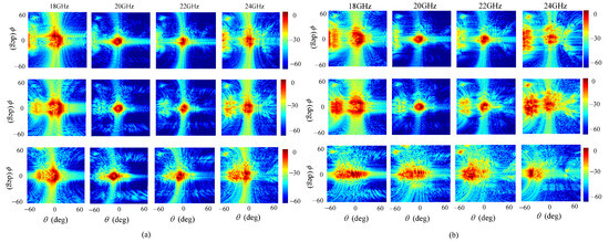 Figure 12 compares the RCS of the metallic plate and FR4 dielectric plate at different incident angles. With incidence angle changes from 30° to 60°, it was found that the RCS distribution of the metal plate was basically the same at the same frequency, which indicates that the RCS was mainly from the mirror reflection. However, for the FR4 dielectric plate, with the increase in the incidence angle, the diffuse reflection gradually intensified, and finally the RCS was completely distorted.
