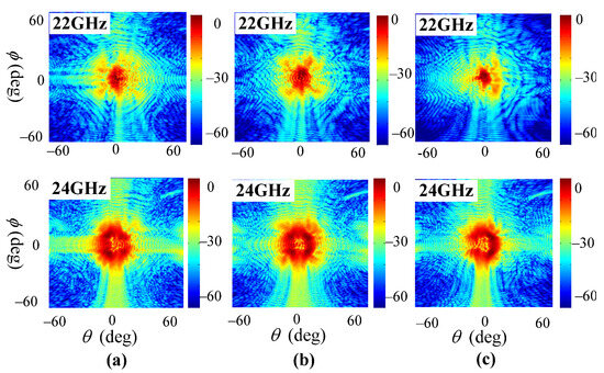 According to the near-far field conversion, the RCS corresponding to the scattered near field could be derived expediently, as presented in Figure 11. Due to the mirror reflection, the RCS for the plate target and the far field radiation pattern of the vortex antenna were similar to each other, which verified the rationality of the near-far field conversion for the measurement of scattering RCS. Unlike the mirror reflection of the flat plate, the zero depth of the forward RCS for the spherical target was weakened due to the diffraction effect. Compared with the mirror reflection of the metal plate, there was a high energy near the main beam of the dielectric plate RCS measured under the same conditions, which was due to the diffuse reflection of the dielectric plate at oblique incidence with more complicated scattering, as depicted in Figure 11a,b. In addition, for the normalized far-field RCS, the diffuse reflection of the dielectric plate at the frequency deviating from the operating frequency was more significant.