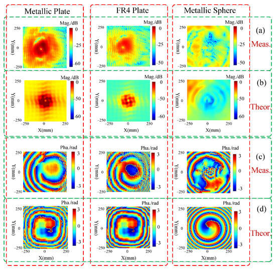 In order to compare the results of the experimental measurements and numerical calculations, the scattered near-field amplitude and phase distributions for the plates and spherical targets are illustrated in Figure 14. Both measured and theoretical results showed that the reflected field of the plate had obvious characteristics of an amplitude hollow and a phase spiral distribution. Since the sphere diameter and the incident vortex beam spot size were close, the forward scattered amplitude was obviously diffracted, and the intensity was weaker than that of the reflected field. The results of the measurement and calculation agreed well, and some phase and amplitude differences may have been caused by non-perfect Bessel vortex waves and measurement errors. In the calculation, the incident wave source was selected as an ideal Bessel beam with non-diffraction characteristics, and the target was an ideal conductive/PEC sphere.