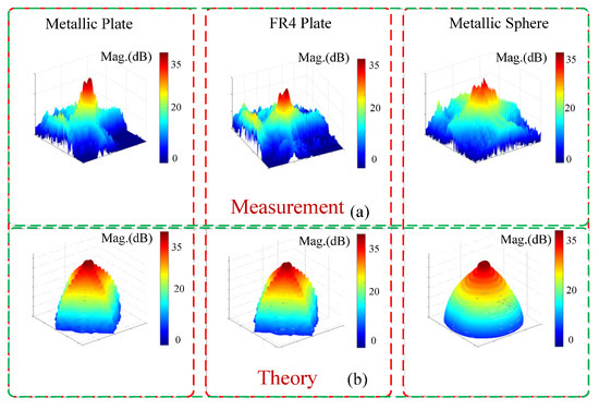 In particular, a theoretical comparison was implemented for the target RCS obtained by the near-far field conversion method, as shown in Figure 15. Both the measurements and simulation showed that the RCS of the metal plate and FR4 dielectric plate had similar hollow distributions and side lobe characteristics. The theoretical scattering for the PEC sphere revealed the non-diffraction characteristics of the Bessel beam, while the fabricated non-ideal Bessel antenna in the measurement generated a bit of a diffracted source. This was the main reason for the RCS difference between the two results. The difference between the measurement results and the theoretical results was mainly due to the difficulty in achieving the physical characteristics of the perfect vortex beam such as the topological purity, half-cone angle, and non-diffraction distance. However, the scattered field of the vortex wave presented by both the theory and measurement had a similar characteristic distribution and the scattering law was basically the same, which has scientific significance in the field of OAM radar imaging and detection.