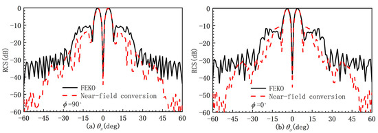 Figure 18. RCS of complex targets obtained by FEKO and near-far field conversion. (a) fai = 90°, (b) fai = 0°.