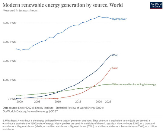 - Energy Institute—Statistical Review of World Energy. Modern Renewable Energy Generation by Source, World. 2014. Available online: https://ourworldindata.org/grapher/solar-energy-consumption (accessed on 1 October 2024).