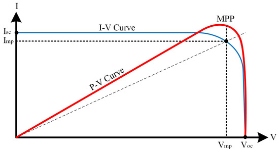 Solar energy is converted into electricity using PV cells. In a typical PV system, multiple cells are electrically connected in series and parallel configurations to form PV strings, allowing for scalable design and power requirements [15,21]. However, the ability of solar energy systems to capture and convert solar irradiance into usable electrical power is a critical factor in their efficiency. Solar radiation and temperature are key factors in determining the efficiency of PV modules. High radiation levels increase energy production, while high temperatures can reduce efficiency due to increased electrical resistance. The optimal power generation occurs when sunlight is abundant and temperature remains within an ideal range to minimize efficiency losses [10,22,23,24]. In order to enhance the efficiency of PV systems, the use of Maximum Power Point Tracking (MPPT) is implemented [25,26]. MPPT is a method employed to optimize the energy extracted from solar modules by ensuring they operate at the maximum power point (MPP). The MPP is the specific voltage and current combination at which a PV module delivers the highest power output as shown in Figure 2. The MPP is not constant and changes with variations in solar irradiance and temperature, reflecting the dynamic nature of these environmental factors. MPPT algorithms are developed to consistently modify the electrical operating point of the PV modules to align with the MPP, thereby improving overall energy capture and efficiency [27,28,29,30,31,32].