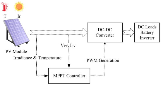 Figure 3 depicts the operating block diagram of the MPPT in a PV system. It includes the interactions between the PV modules, the DC-DC converter, the MPPT controller, and the load. The figure outlines how the MPPT controller continuously monitors the PV system’s generated voltage and current values, processes these data to identify the MPP, and sends appropriate control signals to the DC-DC converter to adjust the duty cycle, ensuring the system operates at MPP.