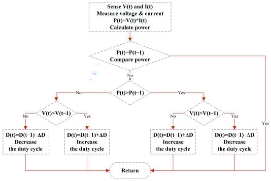The Perturb and Observe (P&O) MPPT algorithm is a widely used technique for optimizing the power output of PV systems. It operates by periodically perturbing the operating voltage of the PV system and observing the change in power output [40]. If the power increases, the algorithm continues perturbing in the same direction; if the power decreases, it reverses the perturbation direction. The main advantage of P&O is its simplicity and ease of implementation, making it suitable for a wide range of applications. However, its disadvantages include potential inefficiencies in the presence of partial shading and its tendency to oscillate around the MPP [41,42]. The flowchart of P&O is shown in Figure 5, where V(t) is the module voltage, I(t) is the module current, P(t) is the module output power, D(t) is the duty cycle of the DC-DC converter, and ΔD is the variation in the duty cycle.