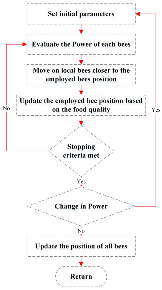 The Artificial Bee Colony (ABC) MPPT algorithm is inspired by the foraging behavior of honeybees to find optimal food sources [79]. Figure 15 shows the flowchart of the ABC MPPT. It begins by initializing a population of bees, each representing a potential duty cycle. Employed bees evaluate their current positions by measuring the PV module’s output power and exploring neighboring positions for improvements. This iterative process continues until convergence to the MPP is reached [80]. The advantages of the ABC algorithm include its robustness in diverse and dynamic conditions, and its capability to avoid local MPP through a balance of exploration and exploitation. However, disadvantages may include computational overhead and the need for careful parameter tuning to ensure optimal performance [81]. The optimization-based MPPT algorithms are compared in Table 4.