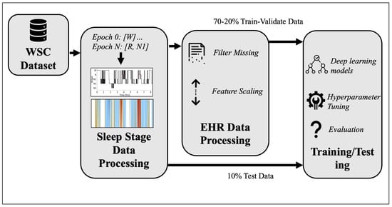 The methodology of this study is structured as an end-to-end sequential pipeline (as shown in Figure 1, involving (i) preprocessing of datasets with hypnograms and hypnodensity graphs, (ii) processing of EHR data, and (iii) training and evaluation of deep learning models.