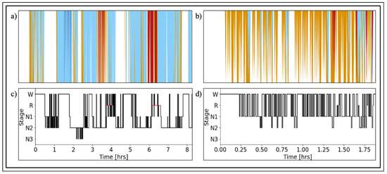 Examples of OSA-Depression labels transformed into hypnodensity graphs and hypnograms. (a) Hypodensity plot for Patient 65492 with high OSA and depression; (b) Hypnogram plot for Patient 65492 with high OSA and depression; (c) Hypodensity plot for Patient 98255 with low OSA and depression; (d) Hypnogram plot for Patient 98255 with low OSA and depression. Color scheme for stages: Wake: White; N1: Gold; N2: Light Blue; N2: Dark Blue; N3: Green; REM: Red.