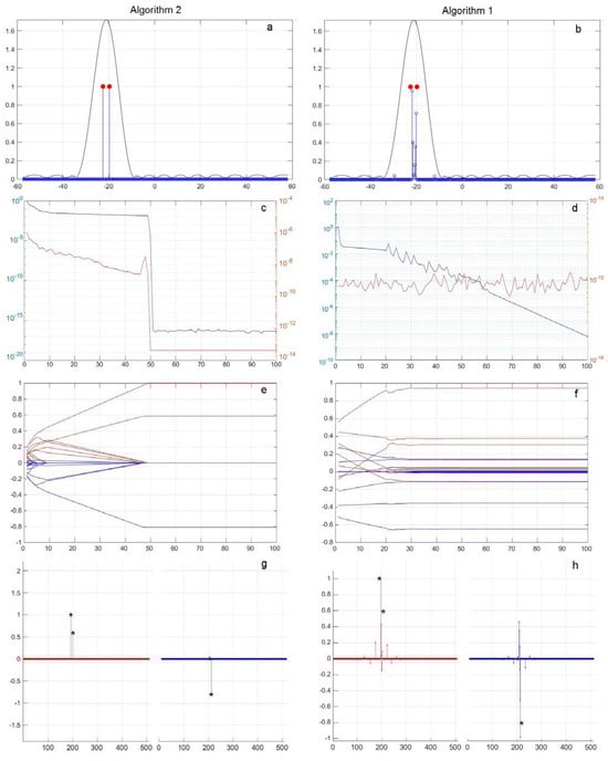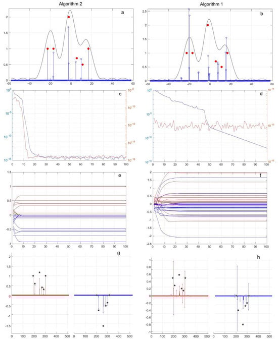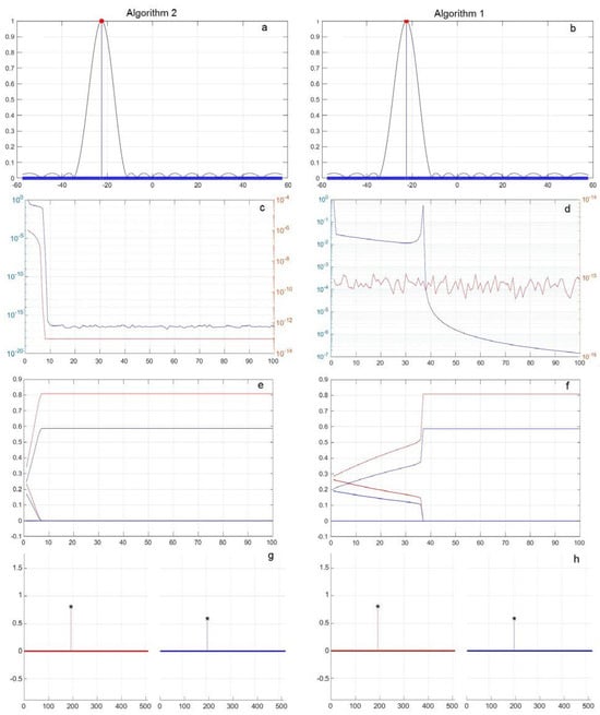 Two sources of 1, = −22.5°, −19.69° and , with values of (a,b) |x|, (c,d) —blue, —red and (e,f) Re(x(t))—red, Im(x(t))—blue and (g,h) Re(x)—red, Im(x)—blue (*—shows the exact values). Algorithm 2—subfigure (a,c,e,g); Algorithm 1—subfigure (b,d,f,h).