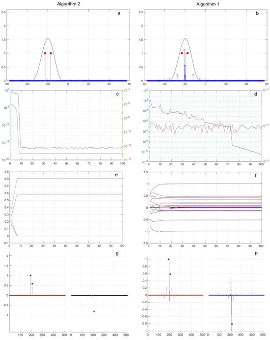 Two sources of 1, = −22.5°, −16.88° and , with values of (a,b) |x|, (c,d) , and (e,f) Re(x(t))—red, Im(x(t))—blue and (g,h) Re(x)—red, Im(x)—blue (*—shows the exact values). Algorithm 2—subfigure (a,c,e,g); Algorithm 1—subfigure (b,d,f,h).
