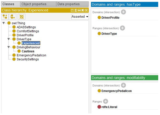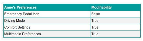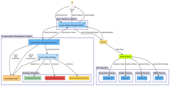 - Driver Profile Ontology.A core component of the system is the Driver Profile Ontology, which serves as a knowledge base for vehicle attributes that can be adapted. Preferences are categorised into three classes: customisable elements (that the driver can change), non-customisable elements (which are fixed and cannot be changed) and semi-customisable elements (which can only be changed under certain conditions). In the ontology, these attributes are defined as properties or constraints, rather than as separate classes.