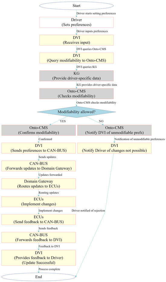- Phase 4: Modifiability: Allowed or not.Once both the ontology and the KG confirm that specific preferences can be modified, the system proceeds.If YES, the changes are permitted. The DVI sends the updates to the CAN-BUS, ensuring the KG is updated synchronously with all modifications. The CAN-BUS then transmits these updates to the Domain Gateway, which routes them to the appropriate ECUs (Propulsion, Safety, Comfort and ADAS).If NO, the requested modification is denied. The DVI knows that some preferences cannot be modified by the Onto-CMS, and it notifies the driver that this modification is not possible. This allows the driver to always know when changes are rejected by the modifiability tests performed by the ontology and the KG. In this case, the DVI does not send any messages to the ECUs, only a notification to the driver.