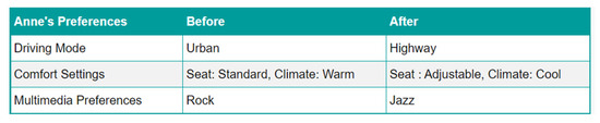 Table 4 summarises the results of this instantiation, detailing the configurations of different driver profiles and showcasing their unique preferences and attributes.