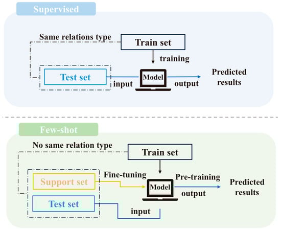 In the field of natural language processing (NLP), relation extraction (RE) represents a significant research domain. The primary objective of RE is to empower models to discern the attributes of relation categories through the analysis of training data, thereby facilitating the identification of relations between entities within the textual context. As depicted in Figure 1, both supervised RE [,,,] and few-shot RE [,,,] are key methodologies. In the case of supervised RE, models can learn the features of the relation types directly from the training data. In contrast, few-shot RE leverages a limited quantity of labeled data from the support set for training or fine-tuning, which requires the models to accurately classify categories with only a few available samples. Consequently, the construction of few-shot RE datasets is more challenging and complex, involving the selection of samples that not only require a sufficient number, but also ensure variety to generalize effectively.