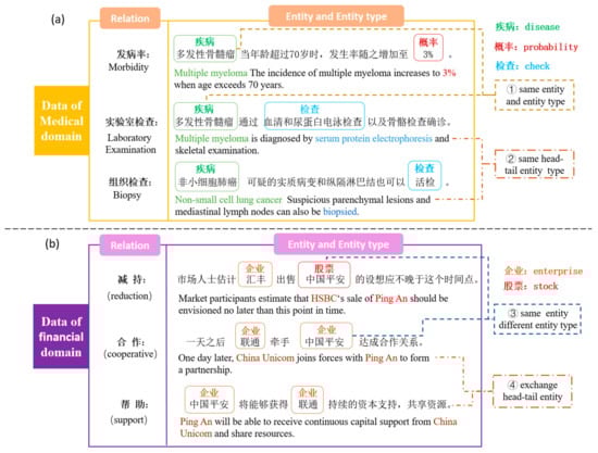 (a) show the characteristics of medical data. (b) show the characteristics of financial data. ① two sentences contain identical entities, ② the type of head and tail entities is consistent in two sentences, ③ the same entity has different entity type in two sentences, ④ the same entity can be both a head or a tail entity in two sentences.