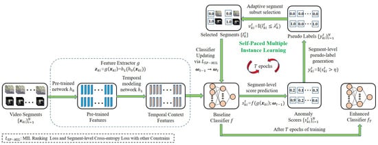 Let { denote the given K training videos which include abnormal videos and normal videos, and the index set of all abnormal videos is while the negative ones . Given a video with N continuous and non-overlapped segments, the corresponding weak label indicates whether contains abnormal events. The baseline model consists of two primary components: a feature extractor g and a classifier f. For each video , the feature extractor g processes video segments as input, generating segment features , which are subsequently fed into the classifier f to determine the anomaly scores . The top-1 or top-k segments with the highest anomaly scores are selected and used to train the classifier using video-level labels.