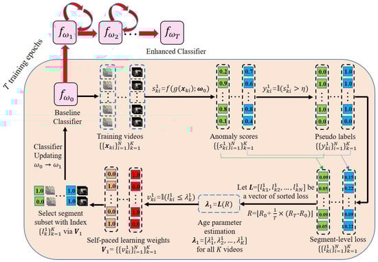 - Adaptive segment subset selection. The purpose of segment selection is to adaptively identify the most easily classified subset of segments from each video in every training epoch. The processes of segment subset selection and classifier updating are iterative. During the t-th epoch of training, this self-paced learning-based segment selection and classifier-updating strategy can be formulated as:where represents the model parameter of , denotes the self-paced learning weight matrix, and represents the self-paced learning weight of i-th segment in the k-th video. represents the age parameter vector, and denotes the age parameter shared for all segments in the k-th video, which control the difficulty of the video. is the easiest subset with the index of segments selected in the k-th video. For each video segment and its generated pseudo-label during the t-th epoch of training, denotes the segment-level loss, which can be calculated using the following formula:is the self-paced learning regularizer; according to [25], it can be defined as . To solve the optimization problem (8), we firstly need to estimated the age parameter according to the loss values of the video segments during the t-th epoch of training. In particular, for all segments and their corresponding pseudo-labels of video , can be estimated as follows. We first compute their corresponding loss values . It is assumed that the easier the segment, the lower the corresponding loss value. According to this assumption, we sort the segment loss values in ascending order. Let be a vector of the sorted loss values. Then, can be defined as the R-th element of , that is,where R denotes the number of selected segments for the video and is defined as follows:where denotes the floor function, and represent the number of segments selected for the subset with index during the initial and final training epochs, respectively, and T represents the maximum number of training epochs. It is worth noting that the age parameter describes the difficulty of each segment. According to the definition of , it will increase gradually with the training epochs t. Then, more difficult segments will be added to the training set for classifier updating. This is also the key of self-paced learning for the strategy of easy-to-hard sample selection. Once all has been well defined, the optimization problem (8) can be solved using the alternative convex search method. Specifically, when is fixed, the optimal can be calculated via Equation (12) [12], and when is fixed, existing off-the-shelf supervised learning methods can be used to determine the optimal .where 1 is an indicator function, Equation (12) shows that when a segment’s loss is less than the given age parameter , it is considered as an easy segment and will be selected (i.e., ); otherwise, it will be unselected (i.e., ). As increases gradually over time, more segments will be selected into the subset with index . This allows the classifier to progressively access more segments, moving from easier segments to more difficult ones, thereby facilitating unbiased prediction.