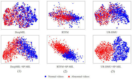 Illustrations of the t-SNE feature distributions of the baseline models and their enhanced models by using the proposed SP-MIL framework. The top sections of (1), (2), and (3) respectively represent the feature distributions of the DeepMIL, RTFM, and UR-DMU models. The bottom sections of (1), (2), and (3) represent the feature distributions of their enhanced models DeepMIL+SP-MIL, RTFM+SP-MIL, and UR-DMU+SP-MIL, respectively.
